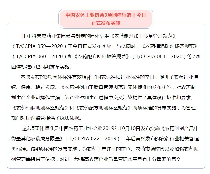 中科榮威藥業(yè)集團(tuán)參與制定的中國農(nóng)藥工業(yè)協(xié)會3項團(tuán)體標(biāo)準(zhǔn)于今日正式發(fā)布實施