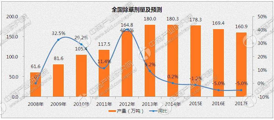 由于近年來除草劑產(chǎn)量的增長率在逐漸下降, 故我們預(yù)測2016年、2017年除草劑產(chǎn)量將以5%的比率逐年下降。故,2017年全國除草劑產(chǎn)量為160.9萬噸。