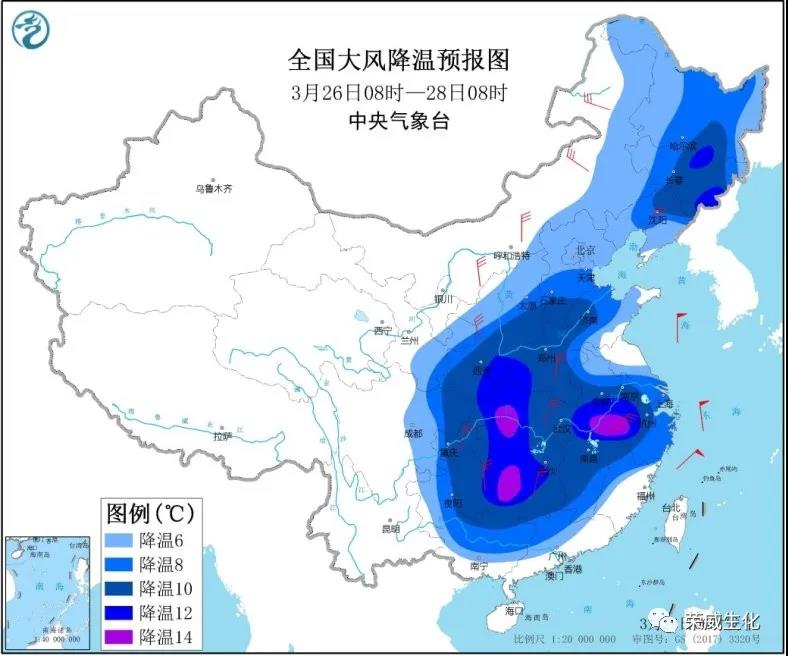 中央氣象臺(tái)繼續(xù)發(fā)布寒潮藍(lán)色預(yù)警:預(yù)計(jì)今明兩天(26日至27日),這股較強(qiáng)冷空氣將繼續(xù)南下,西北地區(qū)東部、華北、東北地區(qū)大部、黃淮、江淮、江漢、江南大部等地先后有4~6級(jí)風(fēng),陣風(fēng)7~9級(jí),上述大部地區(qū)日平均氣溫或最低氣溫下降6~10℃,黑龍江南部、吉林北部和東南部、陜西東南部、河南西南部、湖北西部、湖南西部、安徽南部等地的部分地區(qū)降溫可達(dá)12℃以上。