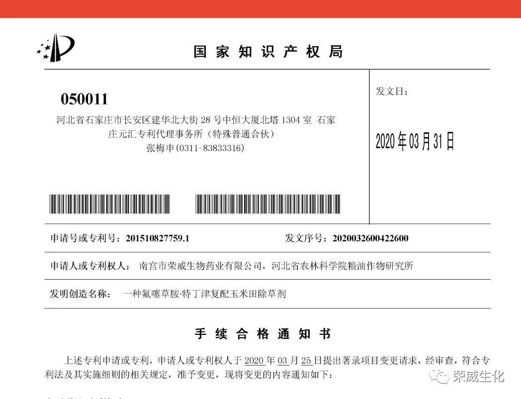 專利二:“一種氟噻草胺·特丁津復(fù)配玉米田除草劑” 于2020年3月31日被國家知識產(chǎn)權(quán)局批準正式落戶南宮榮威生物藥業(yè)有限公司!
