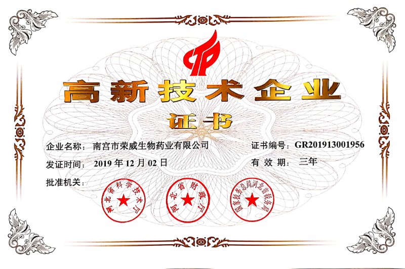 2019年12月2日由全國高新技術(shù)企業(yè)認定管理工作領(lǐng)導(dǎo)小組辦公室發(fā)布的《關(guān)于公示河北省2019年第三批擬認定高新技術(shù)企業(yè)名單的通知》中其中南宮市榮威生物藥業(yè)有限公司入圍!
